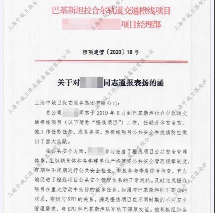 2020年4月,中城卫保安集团收到橙项建管关于对中城卫海外安全官通报的表扬函。信中指出,在中城卫海外安全官任联营体安全官期间,不断攻坚克难,为橙线项目公共安全和疫情防控做出了重大贡献。特别是在疫情大范围爆发时,中城卫海外安全官第一时间采取有效措施,迅速做出应对工作,保证了项目工作人员的安全。